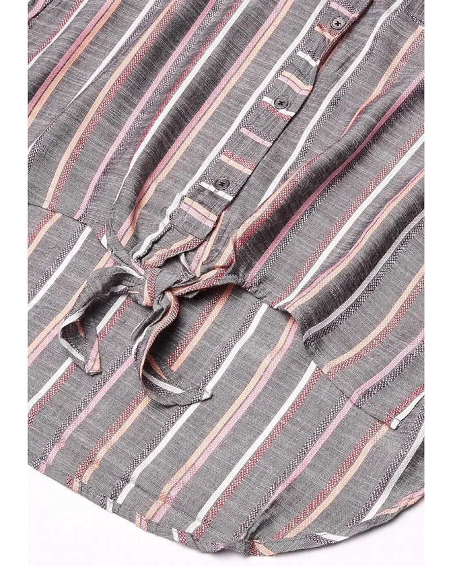 - Shirttail hem with tie detail.