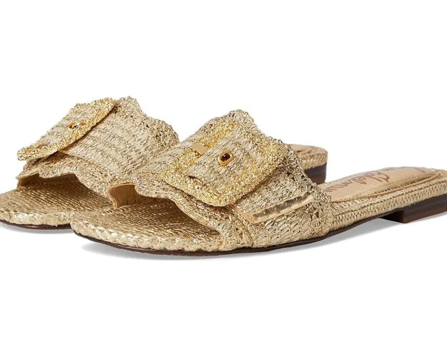 - The Sam Edelman® Bambi 6 slide sandals boast a raffia upper complemented by an oversized resin buckle. Play with proportion and pack a punch. Boasting an open, square toe silhouette, the slip-on flat features polyurethane lining and faux leather insole.