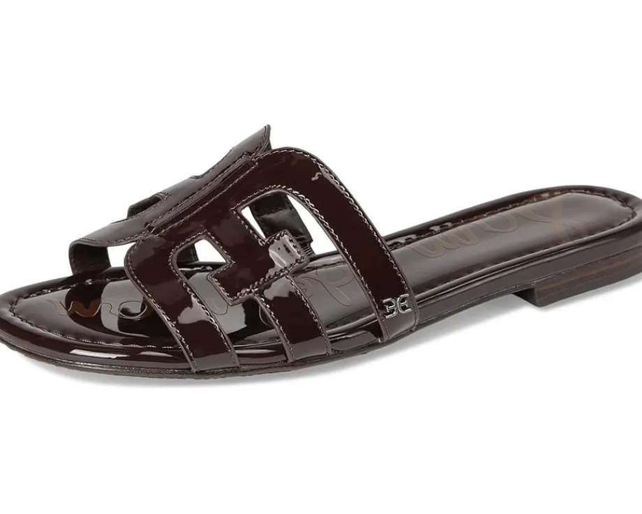 - The Sam Edelman® Bay Slide Sandal is warm-weather chic. Versatile and easy to match, this slip-on style sandal for women looks great from poolside to the polo grounds. These come with a leather upper with intricate cut-out details, polyurethane lining, and a polyester insole. Designed to stand out, these leather slide sandals with cutoff jeans or a simple, flowing sun dress