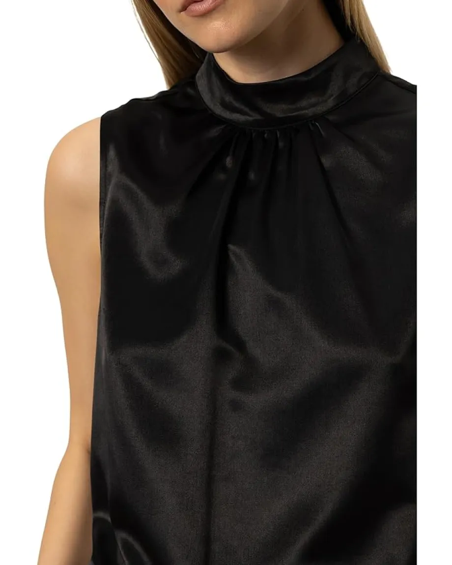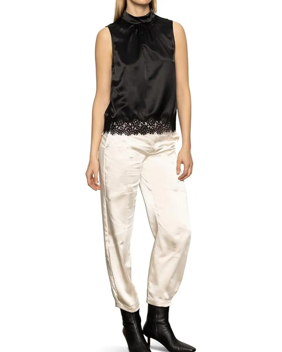 - No matter the occasion, stay flawless in the Sanctuary™ Late Night Satin Tank. Featuring a mock neckline in a sleeveless design, this top offers a back button-and-loop closure with delicate lace trim detailing along the hemline. Pair it perfectly with your favorite skirt or pants and heels for a night out on the town!