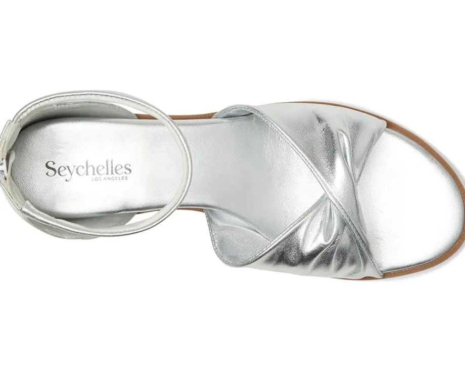 - Embrace the walk wearing the Seychelles® Look Up Metallic Leather Sandal. Crafted from leather upper, lining, and padded insole, this pair of sandals features open round toe, twisted vamp detailing, smooth ankle strap and back zippered closure that keeps the look sleek and refined.
