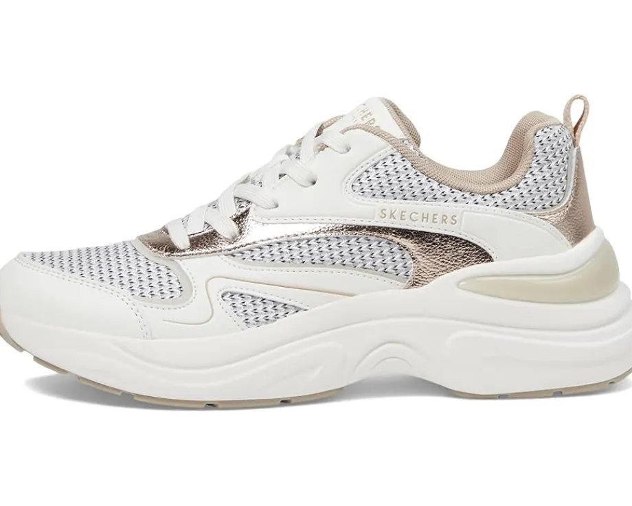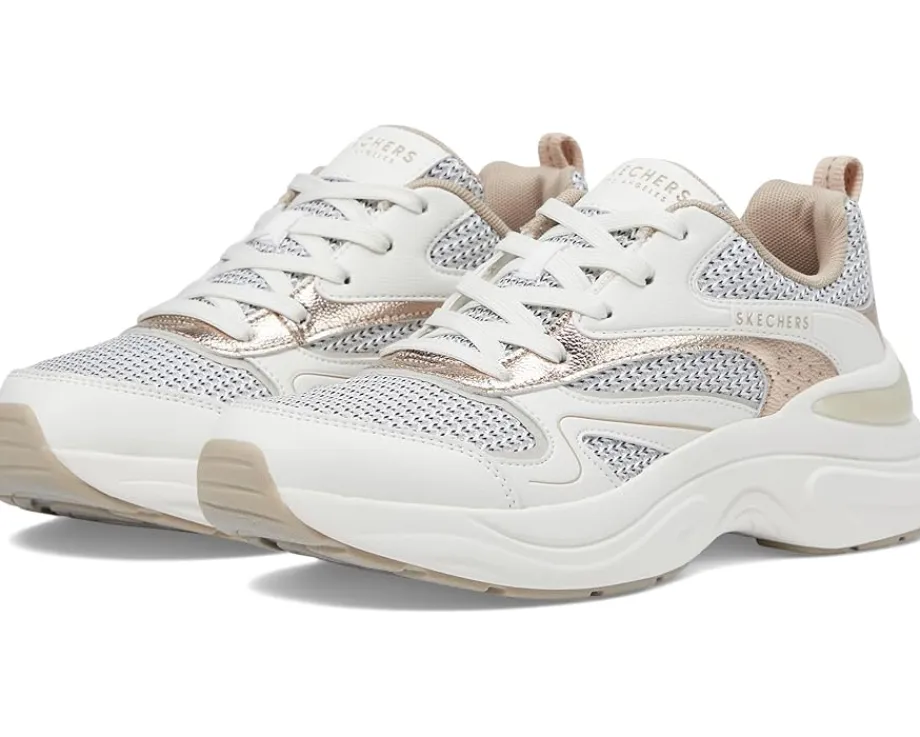 - Add a sporty and casual touch to your look with the SKECHERS® Hazel – Metallic Soiree SNeakers. Designed with a polyurethane upper, polyester lining, and Skechers Air-Cooled Memory Foam comfort insole, these sneakers are versatile and trendy. The round toe shoes come with a lace-up closure for a secure fit.