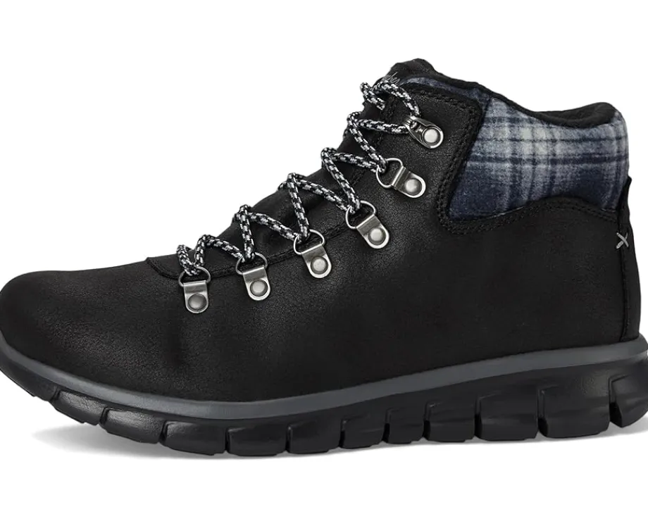 - Chilly weather style meets sporty comfort in the SKECHERS® Synergy – Plaid Mood. This lace-up hiker style boot features a water-repellent microleather fabric upper with a plaid knit trim, faux fur lining, cushioned Warm Tech Memory Foam insole, and a slip-resistant rubber traction outsole.