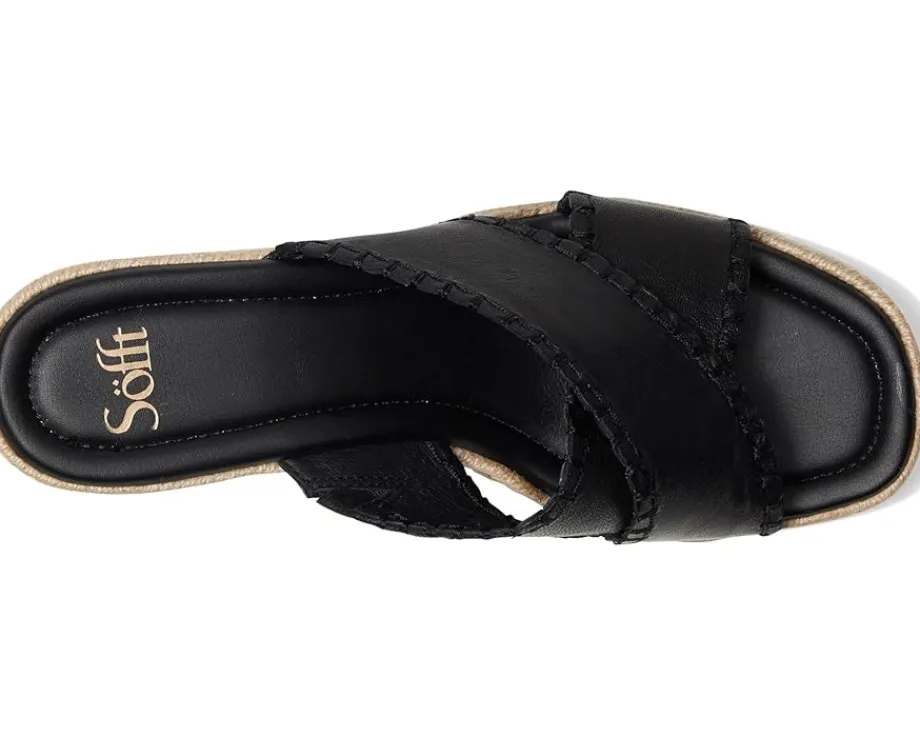 - The Sofft® Indie is here with its X-band slide design and intricate whip-stitching detail. The espadrille style adds a touch of rustic charm, while the wrapped rope wedge mid-heel provides a flattering lift.
