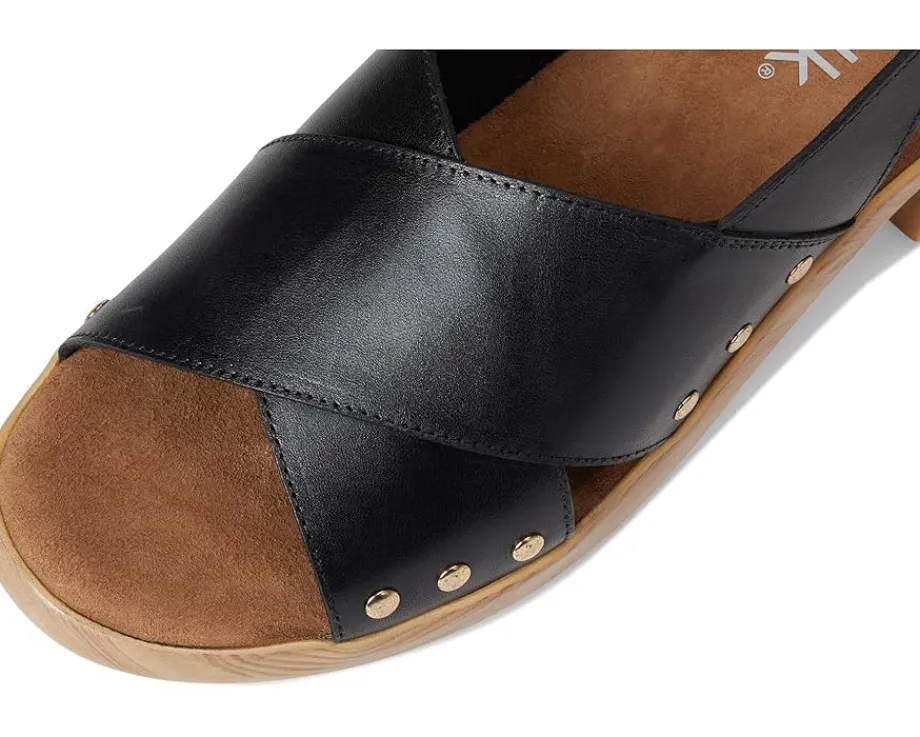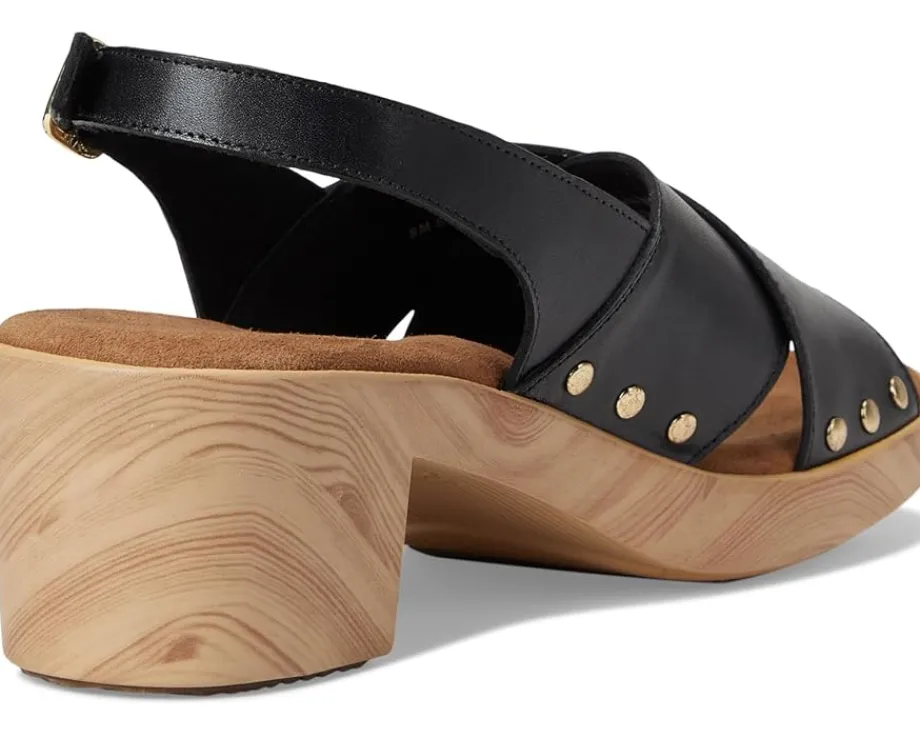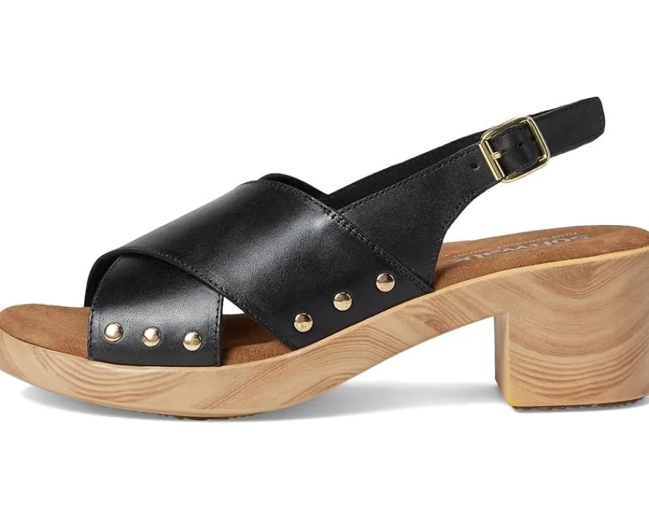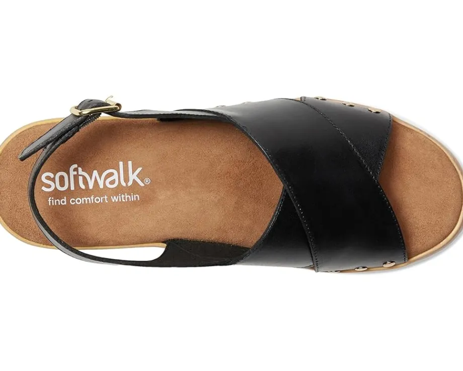 - Embrace the ease wearing the SoftWalk® Florence. Crafted from microfiber upper, leather lining, and footbed, this pair of sandals features open round toe, clog sole with a cross strap sling design that is adorned with chic stud details. The sole has the look of a wooden clog but is actually a lightweight polyurethane sole with rubber insert on the outsole for sure footing. The cushioned footbed is lined in soft suede leather and has arch support.