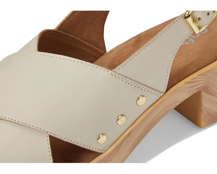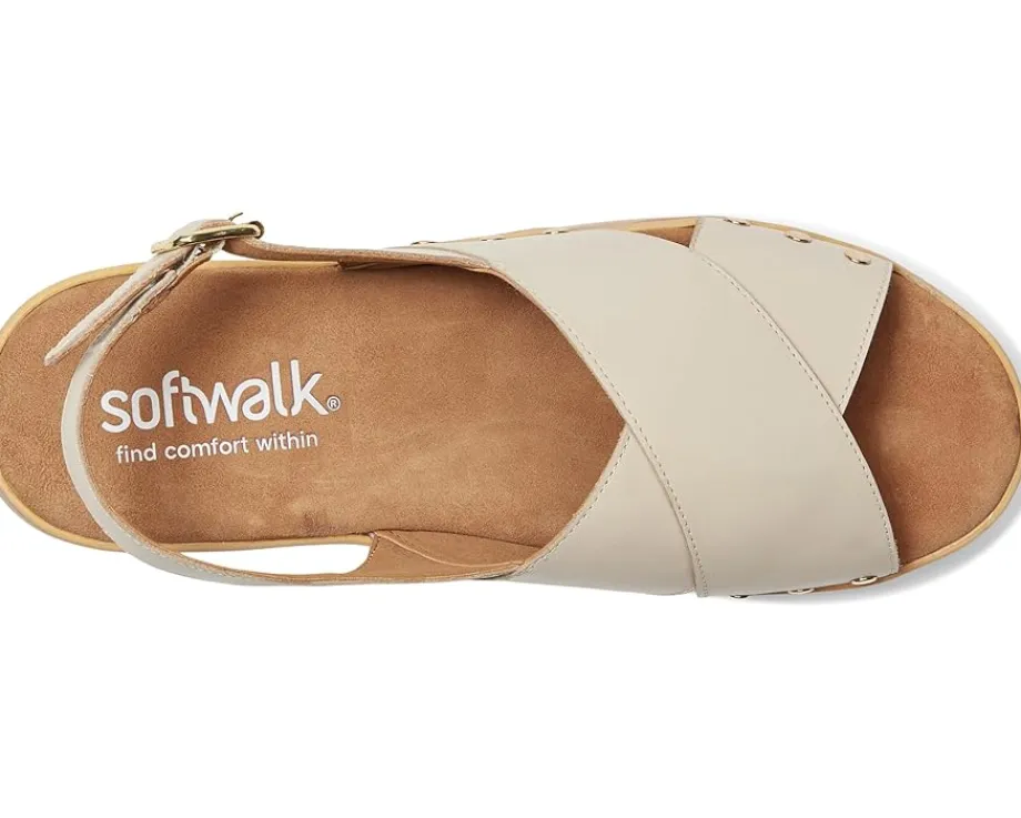 - Embrace the ease wearing the SoftWalk® Florence. Crafted from microfiber upper, leather lining, and footbed, this pair of sandals features open round toe, clog sole with a cross strap sling design that is adorned with chic stud details. The sole has the look of a wooden clog but is actually a lightweight polyurethane sole with rubber insert on the outsole for sure footing. The cushioned footbed is lined in soft suede leather and has arch support.