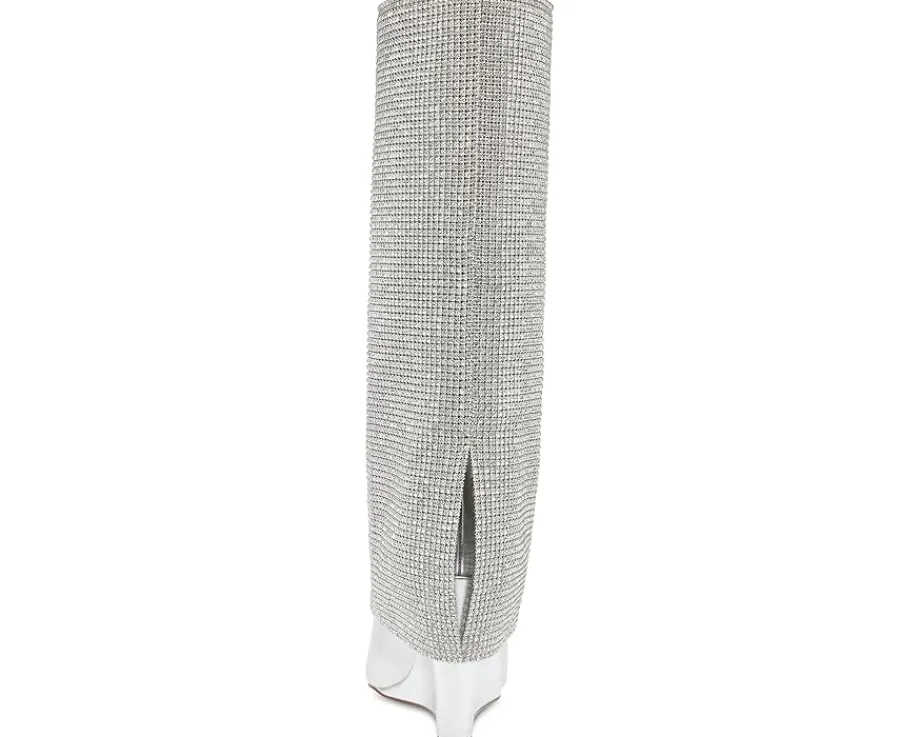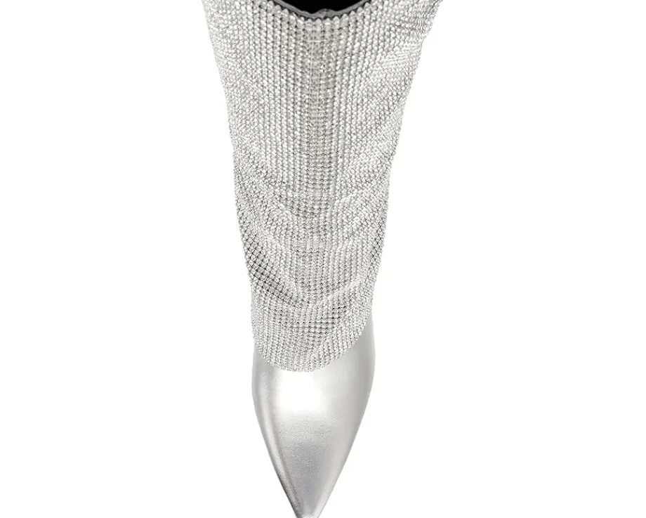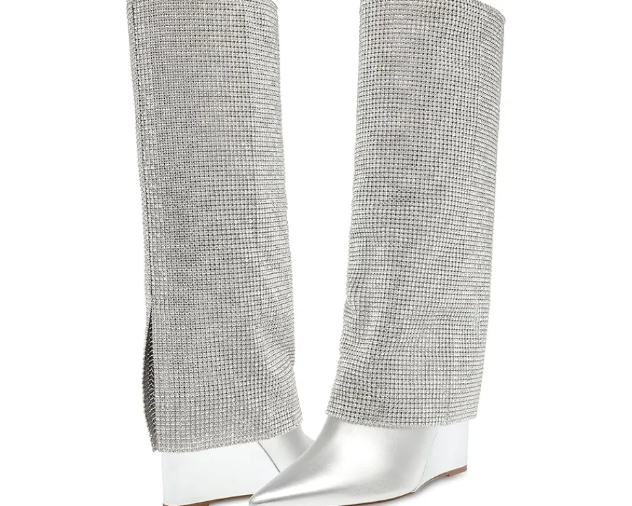 - Carved in a smooth and glossy pointed toe silhouette with foldover rhinestone detailing, the Steve Madden® Riski Boots are sure to add some drama to your look. They are perched on a sleek wedge heel for a chic appeal and come with a zippered interior closure for ease of wear.