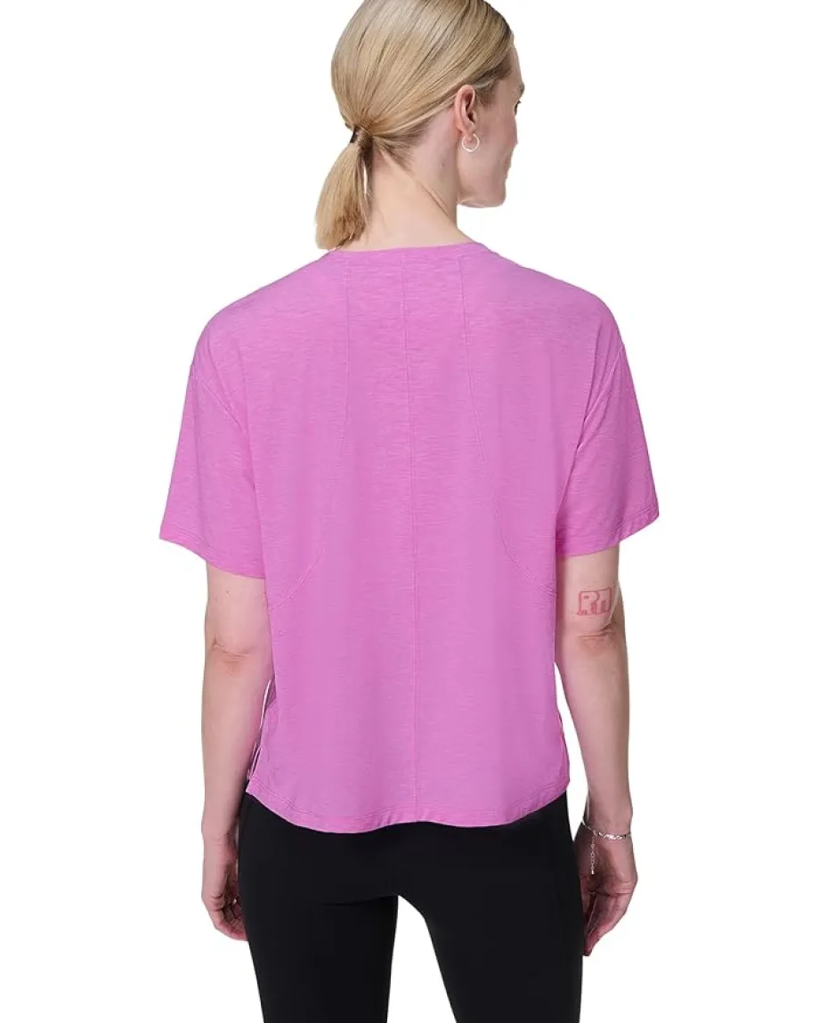 - Sweaty Betty® Soft Flow Studio Tee is made for yoga flows and more Part-recycled fabric for a super-soft touch. It features a crew neckline, short sleeves, a straight hem with side slits, and an easy, relaxed fit.