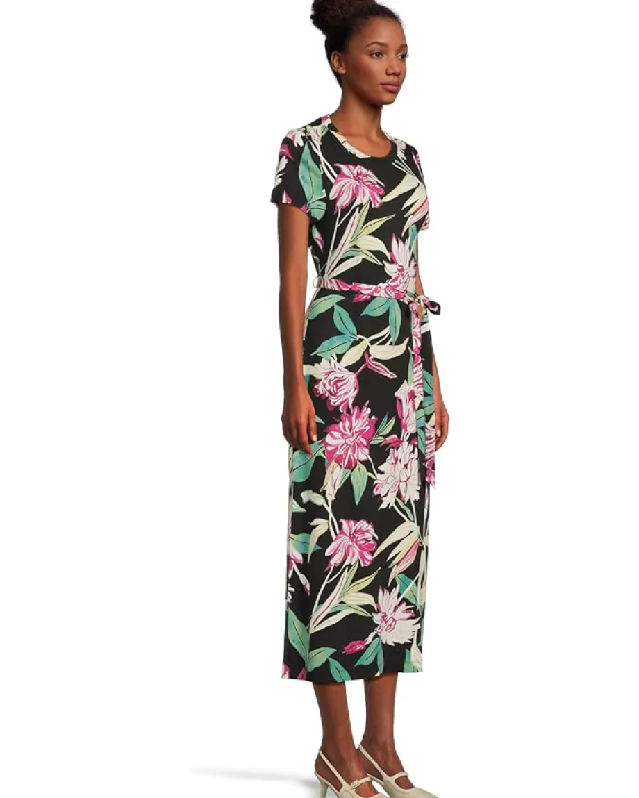 - Printed short-sleeve midi dress with adjustable self-tie belt and a vibrant floral print. Fabric is wrinkle resistant and provides streamlined structure comfortable stretch.
