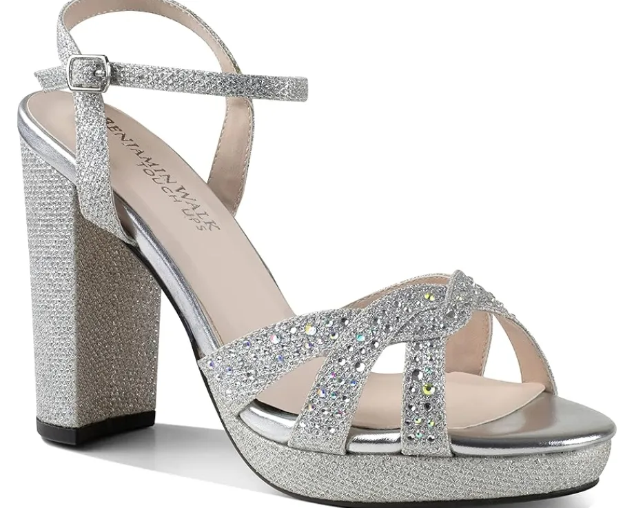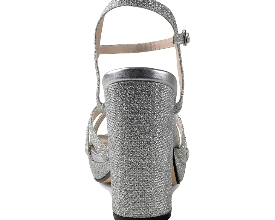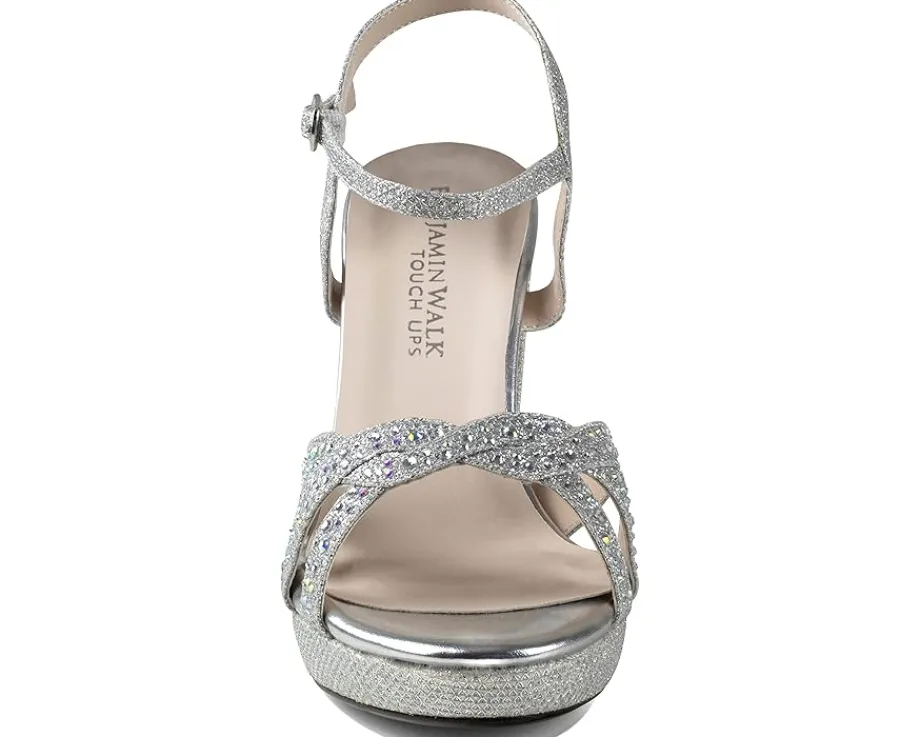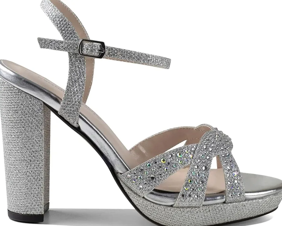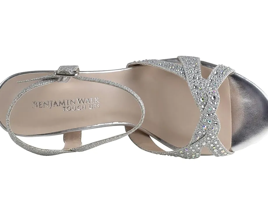 - Crisscross straps on the vamp with rhinestone embellishments.