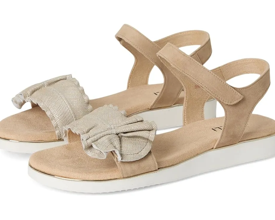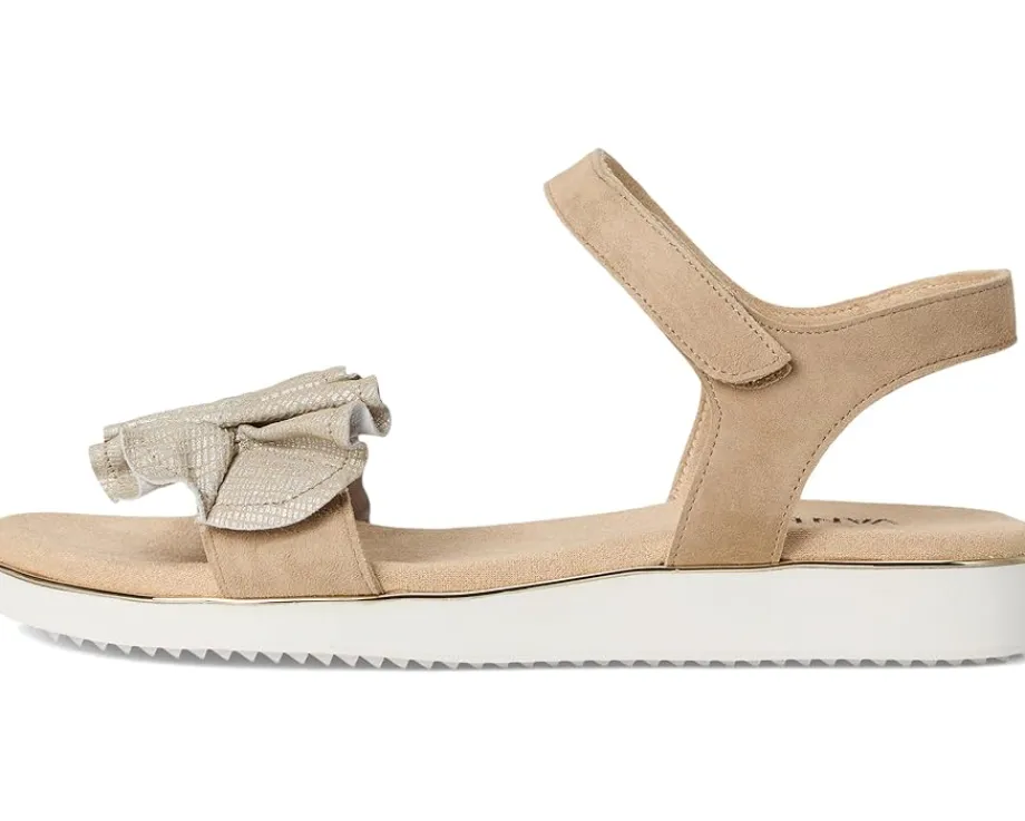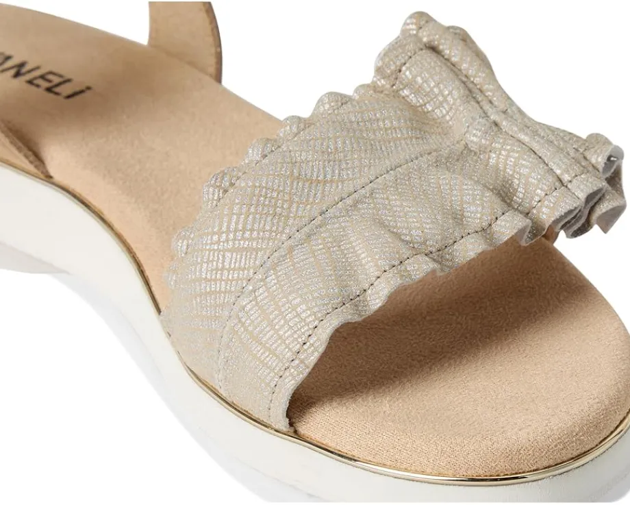 - The Vaneli® Elsbet sandal features ruffle-strap detailing and a hook-and-loop closure, ensuring a secure and adjustable fit. The hidden elastic insert under the buckle adds extra comfort, while the padded insole provides cushioning for all-day wear.