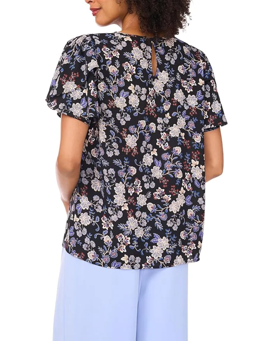 - The perfect balance of sophisticated and spirited: The Vince Camuto® Crew Neck Shirring Top is your new go-to for an elevated everyday look. The jewel neckline and back keyhole with button-and-loop closure offer subtle elegance, while the layered tulip sleeves bring graceful movement and a hint of romance to every step. Wrapped in a vibrant floral print, this blouse is designed to bloom from 9 to 5 and beyond. Whether you’re commanding the boardroom or catching up over brunch, it’s breezy short sleeves and lightweight feel make it your go-to for all-day comfort and style. From workwear to weekend glam, this top adds a feminine flourish that never goes unnoticed.