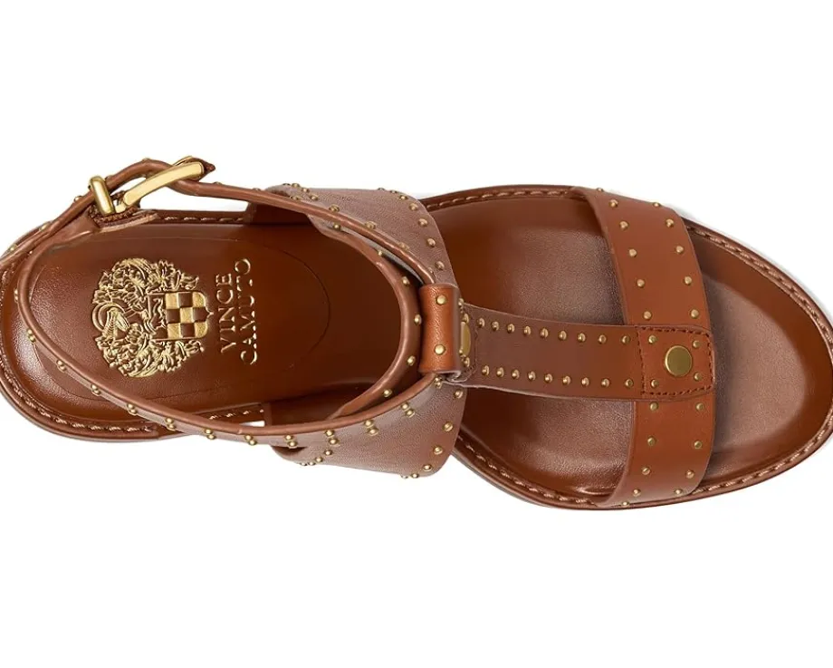 - Add a dash of style to your casual or party wear outfits wearing the Vince Camuto® Faunie Studded Cone Heel Sandals. These are crafted with a leather upper, polyester lining, and a padded polyester insole. The design is accentuated with small gold-tone stud detailing, adding a subtle touch of glam. A secure ankle strap with a gold buckle ensures a comfortable fit, while the stacked cone heel offers a flattering lift with stability. Perfect for pairing with summer dresses or tailored looks, this sandal seamlessly blends sophistication with a hint of boho-chic flair.