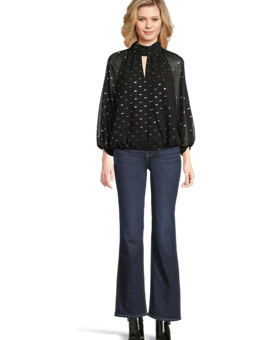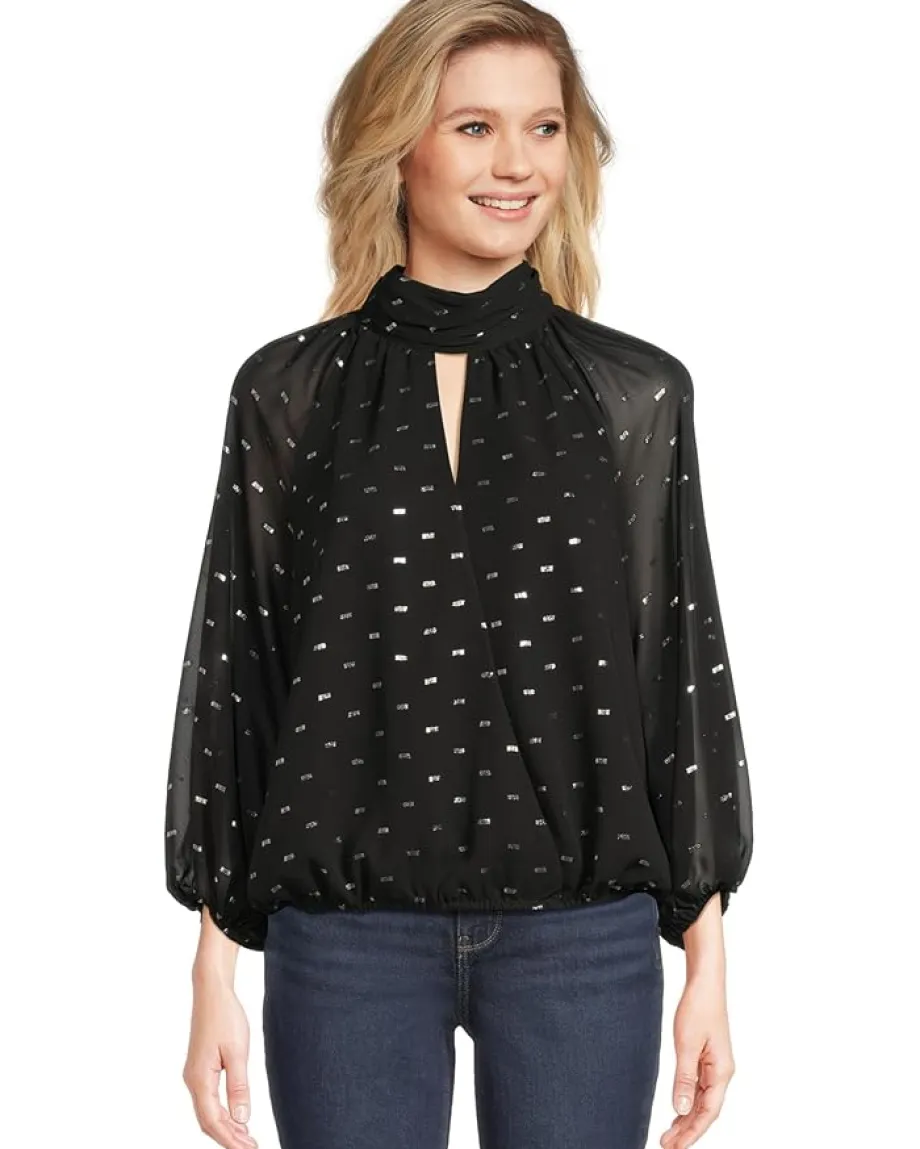 - Look simply stunning by donning the Vince Camuto® Mock Neck Wrapped Long Sleeve Top. The pull-on style top features a mock neck, long sheer sleeves with elasticated cuffs, double back-button closure, an allover eye-catching pattern, and an elasticated hem.