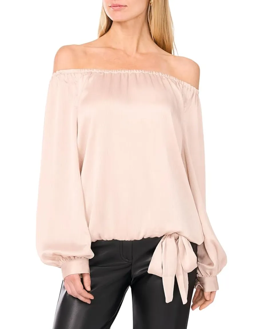 - The Vince Camuto® Off Shoulder Long Sleeve Blouse W Tie showcases an off-the-shoulder neckline framed by billowing long sleeves that add volume and elegance. The tie-front waist cinches the silhouette for a flattering fit.