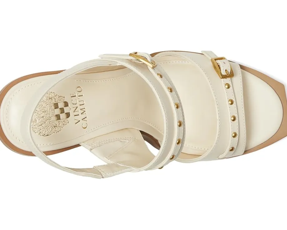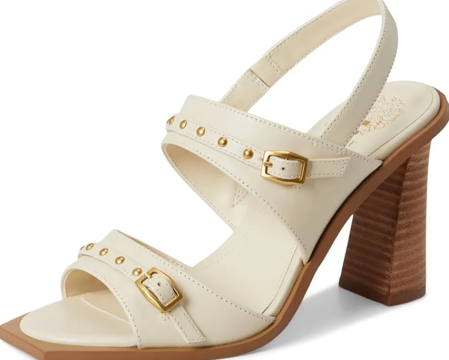 - Make a bold style statement with the Vince Camuto® Ridena Studded Buckle High Heel Sandals. Featuring a flared, stacked heel, these sandals provide both height and stability. The two-band upper with a gored slingback strap ensures a secure, comfortable fit, while metallic pinhead studs and a harmony buckle add a striking touch. Designed with a padded sock and rubber outsole, they deliver lasting comfort.