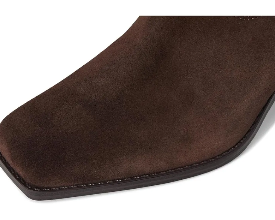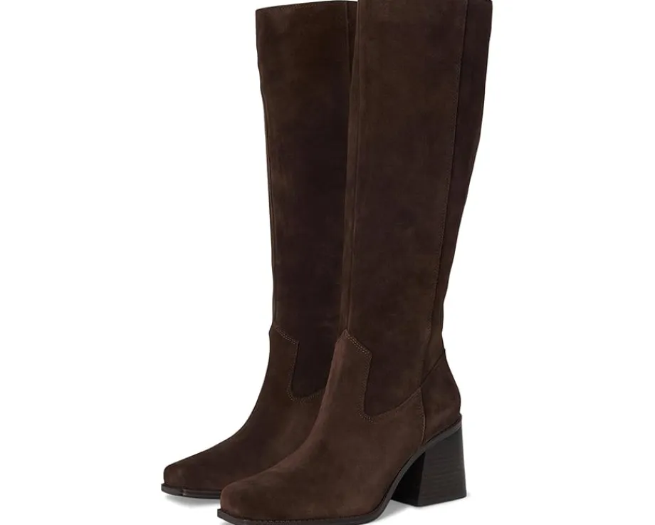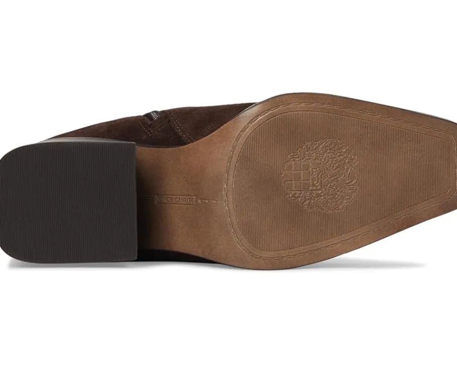 - The Vince Camuto® Sangeti Stacked Heel Knee High Boots are tall boots with a wide shaft on stacked, block heels with a slight flare. These heeled boots are designed with a zippered side closure, a padded polyester footbed, and a gore panel along the topline that gives your style comfort. Their leather upper and polyester lining make them comfortable to wear all day. These knee-high boots are a great choice to style up your looks and outfits.