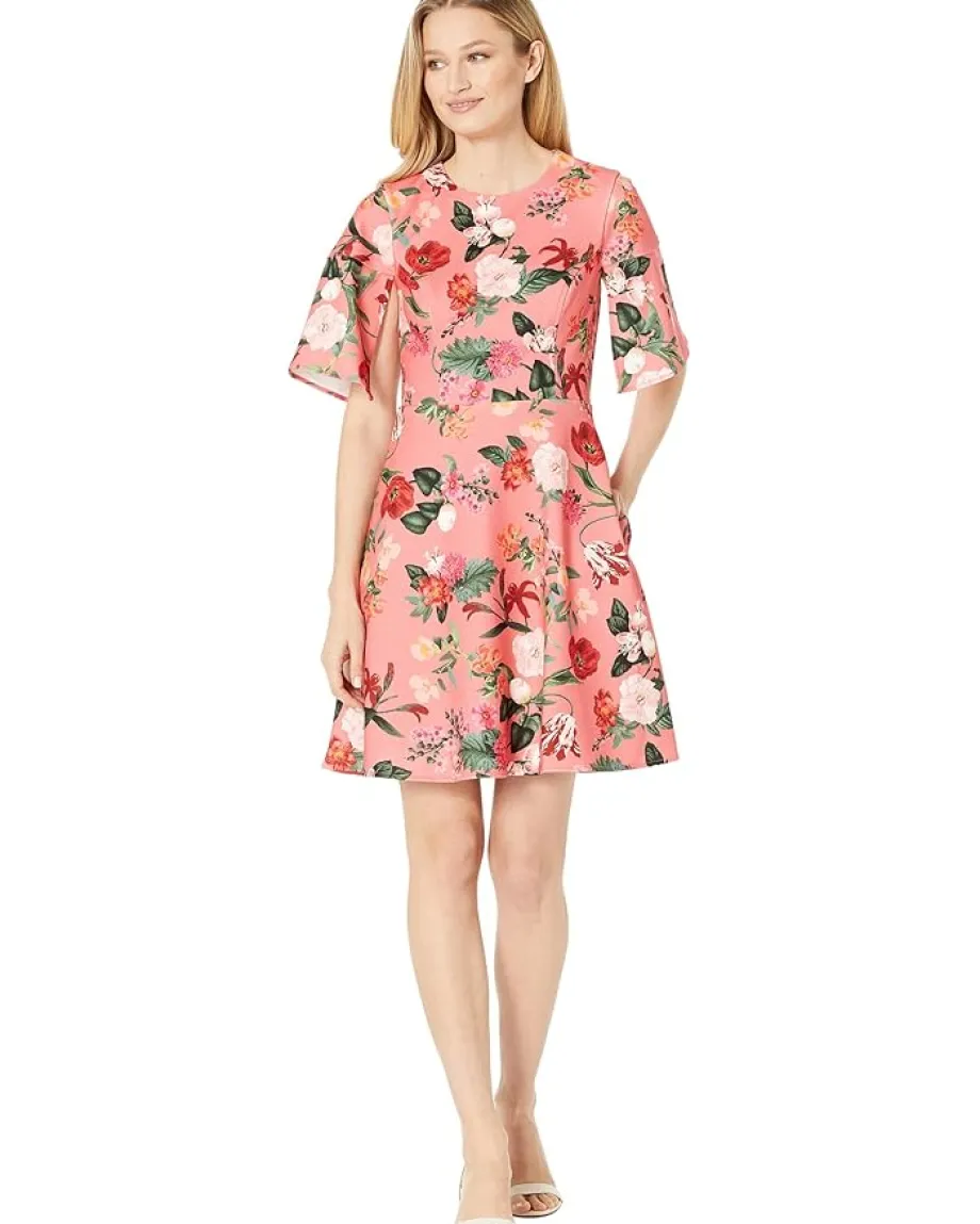 - Dress beautifully in warm days wearing the delightful floral print Vince Camuto® Scuba Crepe Split Flutter Sleeve Fit-and-Flare dress.