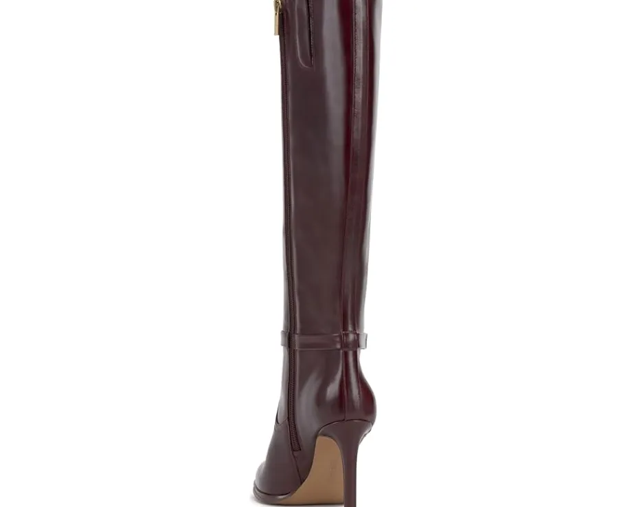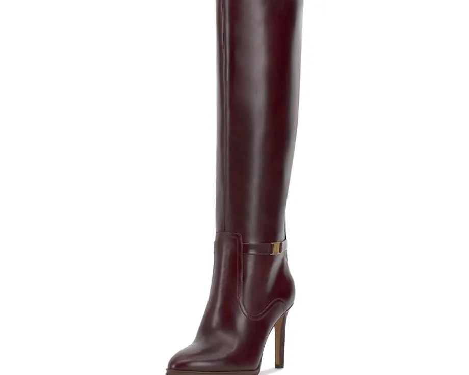- Walk with sleek poise wearing the Vince Camuto® Skylie Boots. The knee-high footwear embodies heritage with leather upper and logo hardware on the ankle belt. This riding boot inspired style is taken up a notch by its covered, stiletto heel. This classic is constructed with an almond toe, micro platform, and inside zip for easy entry.
