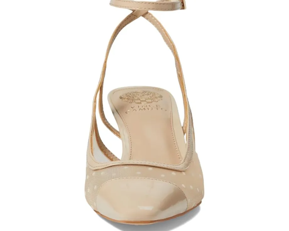 - Elevate your ensemble with a nod to vintage elegance in Vince Camuto® Somlee pumps. These slingback pumps feature an adjustable ankle wrap strap, seamlessly blending old-world charm with contemporary flair. The design boasts a trendy square cap toe crafted from soft patent leather, while the upper is complemented by a unique combination of leather strapping and mesh panels adorned with pin dot details. The sturdy block-shaped, mid-height heel ensures comfort for all-day wear