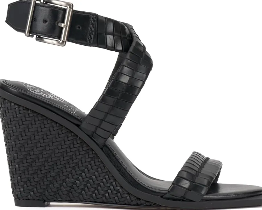 - Move into artisanal elegance with Vince Camuto® Elynna, where sleek style meets comfort. The wrapped and stitch straps exude craftsmanship, leading to a single forefoot band and a crisscross ankle wrap with a secure buckle closure. The wood or woven wrapped wedge complements any outfit, making it perfect for summer suits or floaty frocks. Crafted with a synthetic insole for added comfort, Elynna ensures you stride with confidence and style.