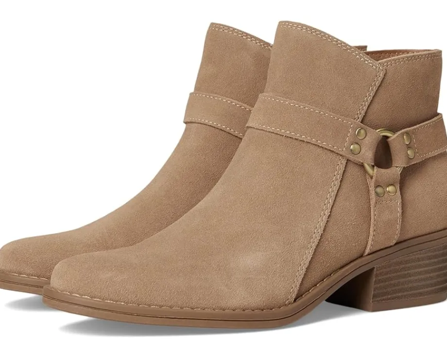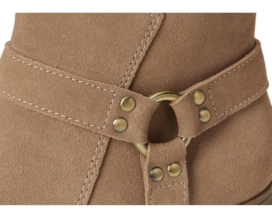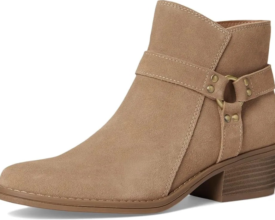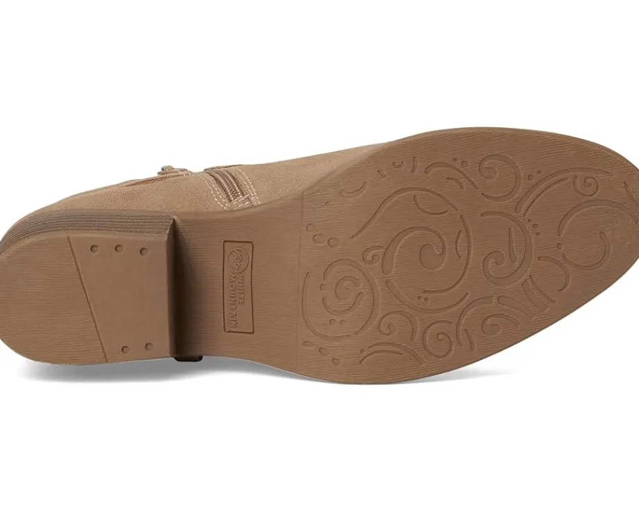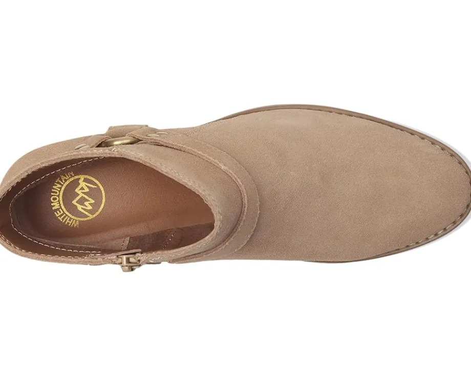 - Strut in the modern western style wearing the White Mountain® Altossa. This bootie is ankle length with a block heel, and functional inside zipper for easy closure. The harness detailing provides a modern look on a western style bootie. It is crafted from leather upper, fabric lining, and foam insole.